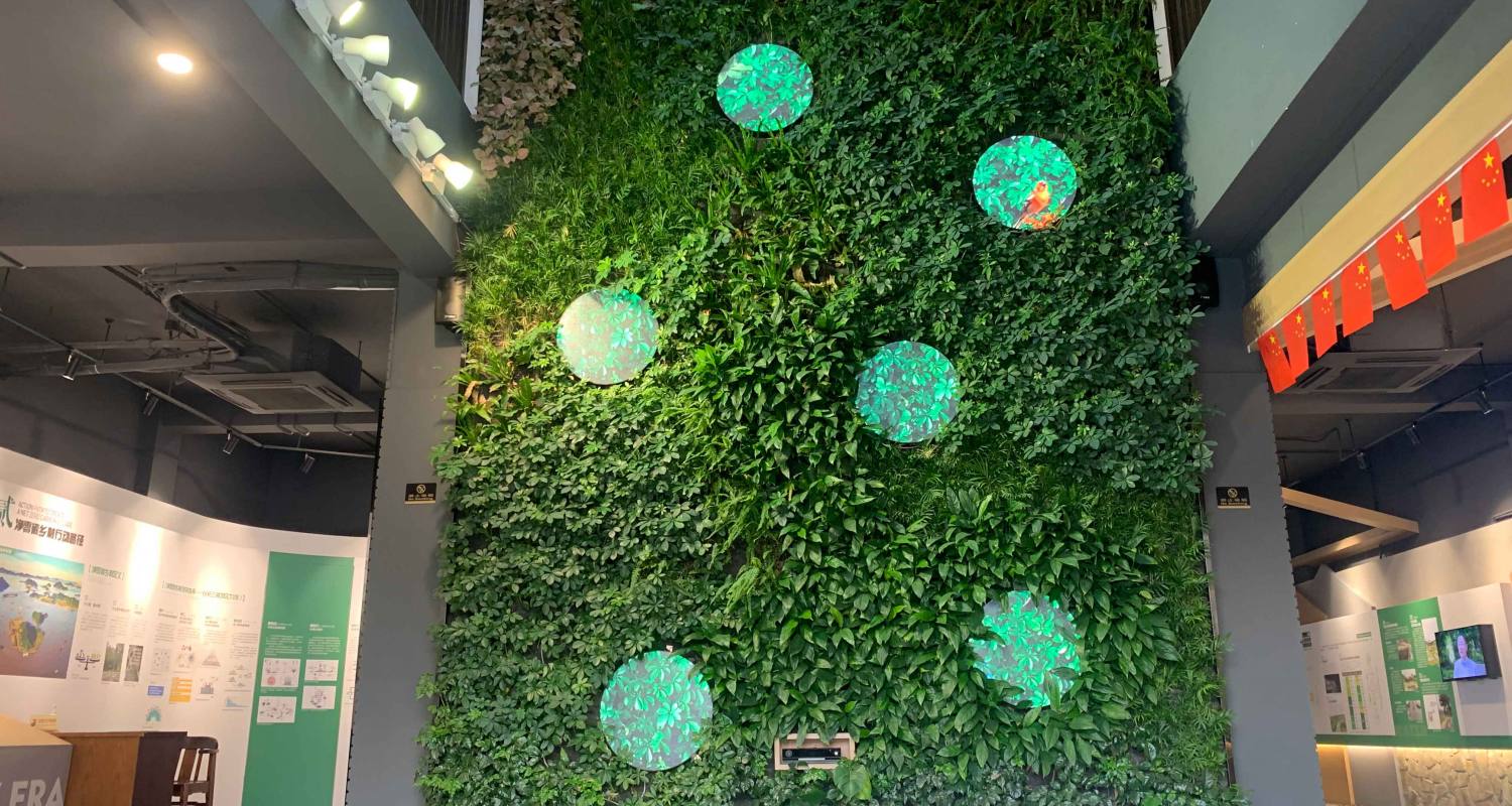 欢迎来到净零碳实践展厅。净零碳又称碳中和,是指通过平衡二氧化碳排放量与移除量实现净零排放。门厅的这个垂直绿化墙向游客传达绿色低碳的主题;在相对静态的植被中加入鸟类鸣啼和花卉开放的动态过程;绿植墙的灌溉系统使用光伏供能,通过监测湿度等指标智能化计算灌溉用水量;通过顶棚提供的自然光照实现展厅的节能减排。整个展厅包括展板展陈区、智慧互动区、沙盘模型区和绿色骑行区,请您自左向右进行参观。